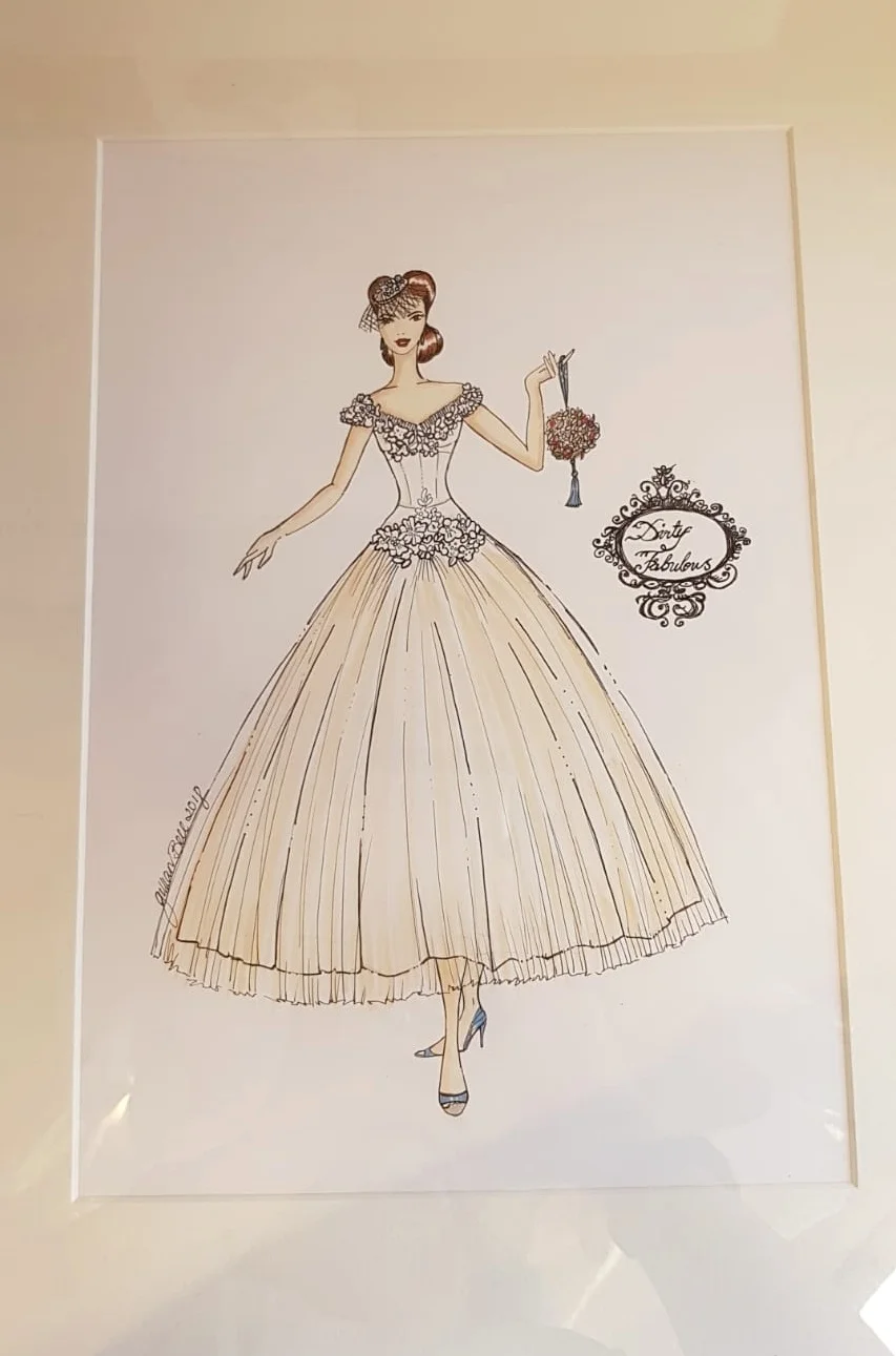 Fashion illustration has the ability to bring a dress to life. It has a wonderful way of showing how something might look when worn and can give a real sense of movement. We adored Gillian's interpretation of our 1950's, Priscilla of Boston, lace and tulle wedding gown.