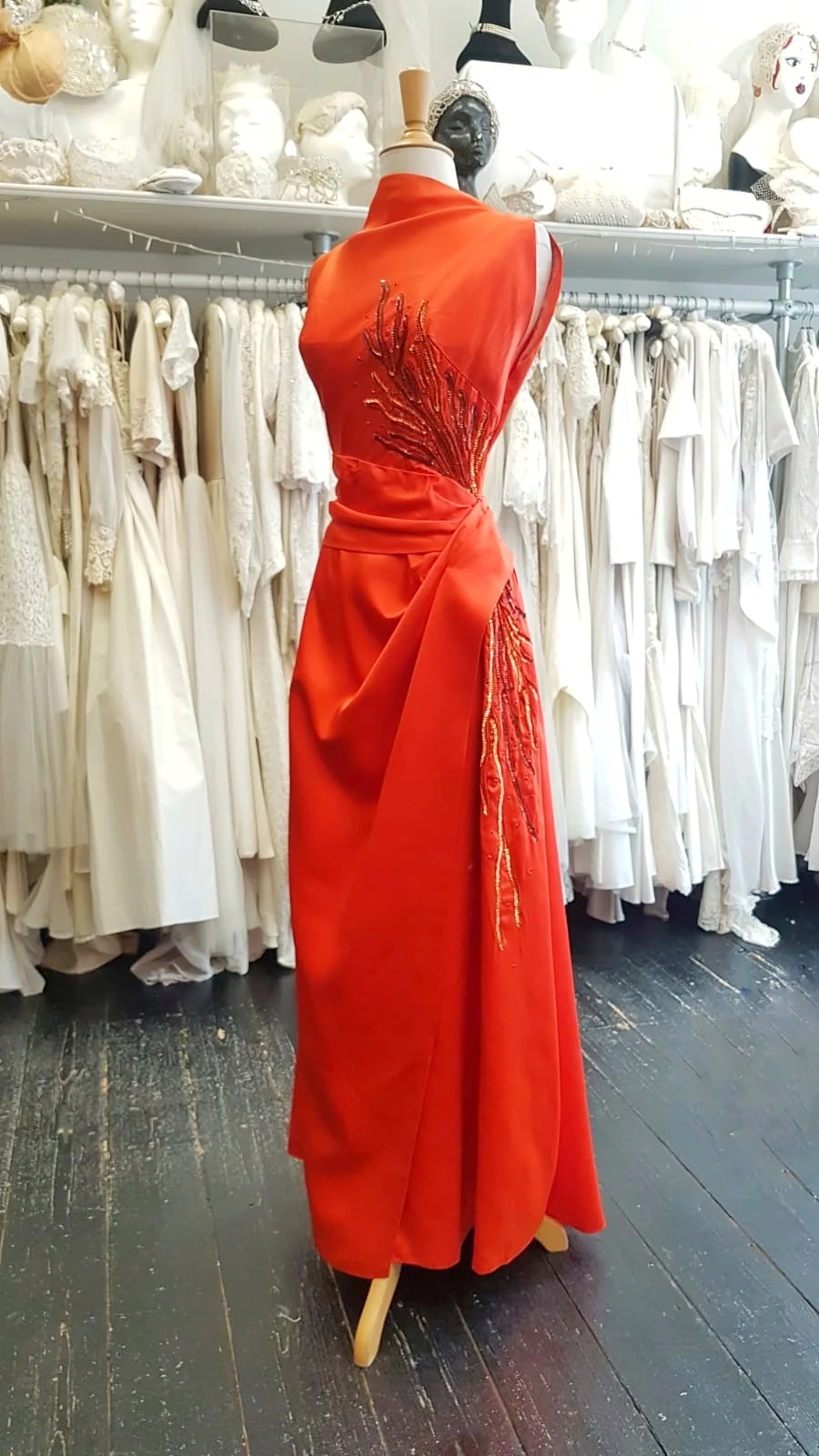 Next up, was one of the most incredible evening dresses we have in store. A 1950's, Emma Domb, fiery red, satin evening gown with sequin flames. This ones a showstopper and Gillian's illustration highlights all it's glamorous details!